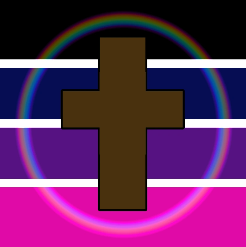 La bandera fue acuñada el 1 de febrero de 2021 por Cryptocrew a pedido de Mileczkaa. [1]El rosa representa la feminidad, el azul representa la masculinidad, el púrpura representa la androginia/neutralidad, el negro representa la falta de género y el blanco representa todos los géneros xénicos/externos. Brown representa la fe, el arco iris representa la comunidad LGBT+ y el amor/promesa de Dios, y la cruz representa el sacrificio de Jesús.