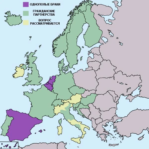 Среди стран, предоставивших однополым парам полноценное право на брак, находятся Голландия, Бельгия, Испания, Швеция, и Канада. Однополые партнёрства (гражданские союзы) узаконены во многих странах Западной Европы (Великобритания, Дания, Норвегия, Гренландия, Исландия, Франция, Германия, Финляндия, Люксембург, Новая Зеландия, Северная Ирландия, Чехия, Словения, Швейцария с 2007 года). Кроме того, в некоторых странах Северной, Южной Америки и Африки (ЮАР) однополые пары могут заключать брак. В различных странах однополые брачные союзы могут называться по-разному; различается и перечень прав, которыми пользуются члены подобных союзов.